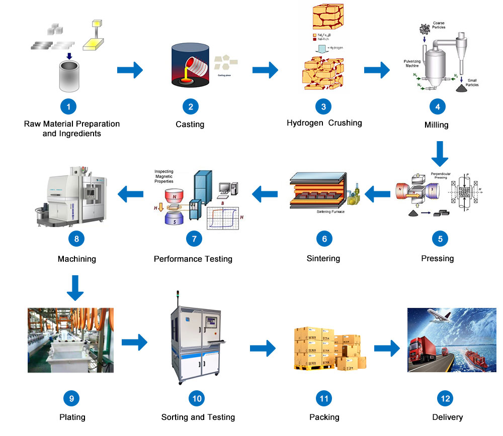 6.機械加工と表面処理:ディスク、シリンダー、リング、正方形、タイル、セクター、さまざまな不規則な形など、実際に使用される焼結NDFEB磁石にはさまざまな形状があります。生産プロセスにおける永続的な磁石要素の形状とサイズが異なるため、大規模な規則的な永久磁石要素を除き、他の磁石を一度に成形することは困難です。したがって、一般的に粉末冶金プロセスでは、焼結と焼き戻しの後に大きなブランクを生産し、次に機械的処理(切断、パンチングなどを含む)、研削加工、および表面コーティング処理を介して、顧客が磁気とサイズの磁気材料を必要とする製品を生産するために生成します。を含む3種類の機械加工があります